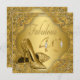 Woman's gold fabulous 40 birthday party invitation with elegant gold diamond bling numbers and pretty gold glitter high heel shoes on a fancy gold background. This beautiful gold high heel shoe birthday party invitation is easily customised for your event by simply adding your details in the font style and colour and wording of your choice. This is a printed design with no real diamonds, gold, glitter, etc.