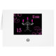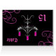 This is a note card decorated as a wedding table number card. This features my drawing of an elegant gothic candle holder in black and grey with bat wings, swirls, and hot pink drippy candles and pink jewels on black. This card is decorated inside and out in case you want to fold these inside out or not so you will want to change the table number on front, back, and inside. Please note that the inside is not glossy so if you decide to fold these inside out, they wont be as glossy as the outside of the card.