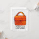 A funny expensive handbag in orange and red with yellow and orange pattern of circles and squares sitting on a textured white background with the words "Zillion dollar fancy handbag".