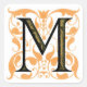 This capital 'M' is set upon a background of gold leaves and scrolls.