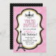 This Paris theme party invitation is fancy and fabulous with pink damask patterns, black and white polka dots and gold glitter-style design! Personalise this invitation for any Parisian theme event with all of your party details!
