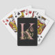 Fancy pink glitter letter K with gold leaves and swirls overlay and a coppery butterfly on grey background.
