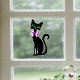 This window cling is a fancy black cat with vibrant green eyes wearing a pretty pink bow.