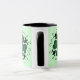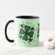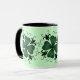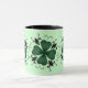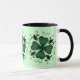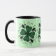 A beautiful shamrock with swirls and Fleur de lis symbols on a pale green background on a cute mug.