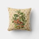 Pretty throw pillow features vintage woodland botanical illustration of mushrooms, flowers and a variety of leaves on a creamy peach and gold harlequin background.