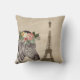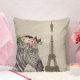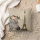 Stylish throw pillow features vintage sepia tint background photo of the Eiffel Tower with overlay of beautiful watercolor zebra portrait with floral crown