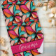 An overall abstract pattern of fantastical style flowers in shades of turquoise, berry, pink and orange accented with black, this colourful design is a fun and recognisable beach towel for your next vacation or pool visit. Personalise with your name or a location.