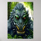 Large fantasy beast with scary eyes and sharp teeth in the forest. This is a AI generated art.