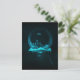 A giant snowglobe contains a metropolitan cityscape with a flying blimp above. The globe sits on an icy pedestal with wires coming out and fading into the darkness. Cool fantasy design in black and turquoise blue. The setting has a icy yet tranquil feel.