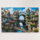 A beautiful and fantastic city of white houses draped in colourful flowers on a seaside cliff, connected by bridges makes a fun jigsaw puzzle.