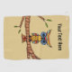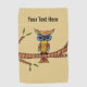 This golf towel is a light brown colour with a fantasy colourful owl in red, yellow, and blue with big blue eyes sitting on a tree branch with green leaves. Customise your text with the template.