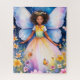Jigsaw puzzle of a young girl with butterfly wings stands in a vibrant garden, surrounded by colourful flowers and glowing stars. Her dress is multicolored, and she wears a crown of flowers in her curly hair.
