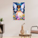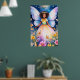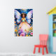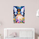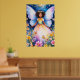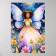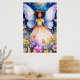 Poster of a young girl with butterfly wings standing in a vibrant garden, surrounded by colourful flowers and glowing stars. Her dress is multicolored, and she wears a crown of flowers in her curly hair.