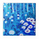 Ceramic tile in a semi-abstract illustration of a fantasy forest with flowers, foliage, trees and birds, in shades of cobalt blue and white