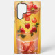 A unique phone case with an artistic design of fresh strawberries floating in a sparkling, fantastical glass. The vivid red of the strawberries stands out beautifully against the glittering golden liquid, creating a playful and eye-catching look. This is the perfect accessory for those who love food or fruit motifs and are looking for a stylish and unique item. It also makes a great gift.