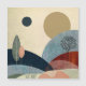 An abstract landscape of rolling textured hills with trees and plants in bold colours of red, orange, beige, green, and tan.