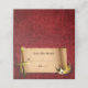 Fantasy knight's sword Jewish Bar Mitzvah tent style place card or escort card. This mediaeval times fantasy sword and sorcery Bar Mitzvah place card features a red velvet look background, a simulated parchment scroll, a knight's, king's, or prince's sword, and a crown.
