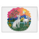 A white Devonshire Rex cat s the focus in this design called Fantasy Land that includes a golden castle on a hill by a crystal blue river, a magical unicorn, and a dove of peace.