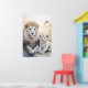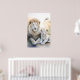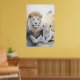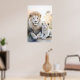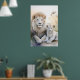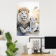 Poster of a majestic adult lion and an adorable cub sitting closely together in a serene, pastel-coloured setting with delicate flowers in the background. Their soft, white fur and calm expressions convey a sense of warmth and familial bond.