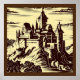 Look no further than this stunning design of a mediaeval castle, done in the style of a woodblock print. This illustration depicts a majestic castle perched atop a cliff. This design is sure to be a conversation starter and will add a touch of elegance and history to any room.
