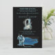 The design is mostly White Indigo Denim Blue for this Fantasy Fairy Tale Mediaeval Castle and KNIGHT in SHINING ARMOUR kneeling with his SWORD and Mediaeval CASTLE STAIR WAY Wedding Invitation.