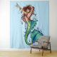An auburn-haired mermaid with auburn hair and a teal tail, gracefully poised against a clean light blue backdrop. Surrounding her are blue water bubbles