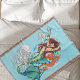 An auburn-haired mermaid with a teal tail, gracefully poised against a light blue backdrop. Surrounding her are blue water bubbles In front of her, a jellyfish in light pink and white, while a large orange seahorse floats beside her, adding a splash of vibrant contrast. From her outstretched right hand, seashells and a pearl necklace tumble downward. Adorned with shimmering gold bracelets