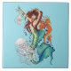 An auburn-haired mermaid with a teal tail, gracefully poised against a light blue backdrop. Surrounding her are blue water bubbles In front of her, a jellyfish in light pink and white, while a large orange seahorse floats beside her, adding a splash of vibrant contrast. From her outstretched right hand, seashells and a pearl necklace tumble downward. Adorned with shimmering gold bracelets