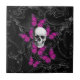 Chic elegant sophisticated girly, cute romantic fantasy skull and bright pink or magenta butterflies, digitally collaged, on a black vintage Gothic Baroque background pattern, perfect for day of the dead or as a pretty goth gift for her. Visit the LEATHER_AND_LACE STORE for more alternative gothy gifts. This design was created from a vintage skull and some vintage purple butterflies and a stylish black swirly floral damask background, which was a photograph of an old gate. This stylish day of the dead style design would make a great gift for her. Goth alternative girls would love this pretty romantic original design. Easily personalise this by adding your name or text to create a persona gift that she will love.