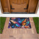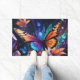 Jewelled Flower Rhinestone Butterfly Crystal Rug in purple, teal, green and vibrant healing crystals. Welcome guests with a vibrant butterfly bling Mat Home Decor. Colourful cyrstas and monarch butterflies in a fantasy spring garden. Multi-coloured crystals decorating a butterfly in amazing garden background. Front or back door or kitchen rug mat, Customise your text, colour, style on your crystal monarch butterfly mat to match your taste.