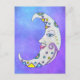 This postcard has a white fantasy crescent moon with a face and colourful abstract markings in blue, purple, and yellow in a blue and purple sky with tiny stars.