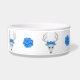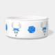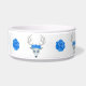 This pet food bowl is circled with fantasy white deer heads with large white antlers, blue eyes and roses on their heads. Pretty big blue roses are in between the deer.