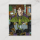 A young male wizard holding an old book that has a small cute green dragon sitting atop of the book. In behind them is a library filled with books, potions, cauldron, crystal ball and plants