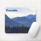 Blue mountains, blue lake water, dark green trees, pink fireweed, and overcast.  A  depiction of summer in the far north. Customisable text reading "Canada" also appears. Mosquitoes not included.