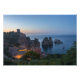 Photo print of the big Faraglioni rocks in the water of the Mediterranean Sea and the old red Tonnara, tuna factory in Scopello, at the north coast of Sicily, Italy at the Blue Hour of dusk.