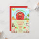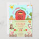 A children and kids farmyard ranch and petting zoo birthday invitation. On a sunny day, a red barn is shown surrounded by farm yard animals including a cow, sheep, pig, horse, rabbit and chicken. Personalise by editing with your unique event details.