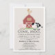 This cute and modern "oink, moo, cock-a-doodle do" gender-neutral baby shower by mail invitation features a pig, chicken, and cow with a red barn on a beige background framed by a white border. The reverse side features a white background with black cow patterns. Personalise for your needs. You can find matching products at my store.