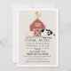 This cute and modern "oink, moo, cock-a-doodle do" gender-neutral virtual/online/zoom baby shower invitation features a pig, chicken, and cow with a red barn on a beige background framed by a white border. The reverse side features a white background with black cow patterns. Personalise for your needs. You can find matching products at my store.