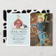 This cute and modern "oink, moo, cock-a-doodle do" gender neutral or boy's birthday photo invitation features a pig, chicken, and cow with a red barn on a light blue background framed by a white border. The reverse side features a white background with black cow patterns. Personalise for your needs. You can find more matching products at my store.