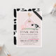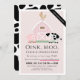 This cute and modern "oink, moo, cock-a-doodle do" girl's virtual 1st/first birthday party invitation features a pig, chicken, and cow with a pink barn on a blush pink background framed by a white border. The reverse side features a white background with black cow patterns. Personalise for your needs. You can find matching products at my store.