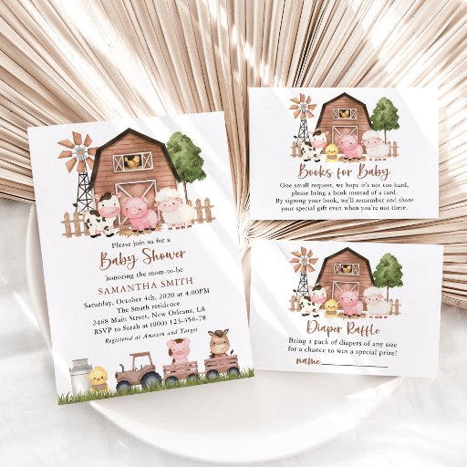 Invite friends and family in style and set the tone for your special day with this charming baby shower invitation. Design features farm animals (cow, horse, sheep, pig, rooster, chicken), brown barn and brown tractor.