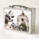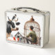 This lunch box has farm animals looking a boy in a cage pictured on it.
