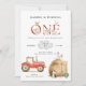 Celebrate your little one's first birthday in style with our charming "Barnyard Fun" birthday invites! Perfectly designed to capture the joy and excitement of this special milestone, these invitations feature an adorable watercolor farm scene that will delight both kids and adults alike. Surrounding the bold, playful lettering of "ONE" are the cutest farm animals, including a smiling cow, a friendly pig, a cheerful lamb, and a curious chicken. At the heart of the scene is a vibrant red tractor, ready to bring the farmyard festivities to life, alongside a golden hay ball perched with a proud rooster and a loyal farm dog.