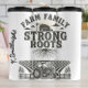 This is a rustic graphic design with a farm theme. The central image features a classic barn with a windmill. A root system is visible below the barn and phrases "FARM FAMILY" and "STRONG ROOTS" are displayed above and below the scene in a bold, weathered font. Below, a tractor is shown in a ploughed field with a fence and wheat bundles.
