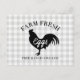 Chicken silhouette in centre with "eggs" text overlay on grey and white gingham plaid background. Additional text: "Farm fresh, free range, organic". Great home decor piece for farmhouse, country and rustic themes.
