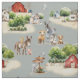Farm themed fabric for sewing and crafts. A large scale pattern of farm houses, red barns, trees and animals, with a gray-blue background covers the material of your choice. Perfect for a baby or child's bedroom.