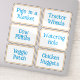 Farm themed birthday party food table stickers. One sheet of six stickers to customise with your choice of text in a fun font in blue. Describe the food being served and give it a farm flair, such as; cow patties, chicken nuggets, veggie patch and pigs in a blanket. Or, use simple descriptions, in one line or two. The size of the individual stickers will depend upon the size sheet ordered. This sheet is 8x8 inches so each sticker will be approximately 3.5 x 2.5 inches (this is not exact).