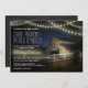 Farm String Lights Rustic Barn Wedding Invitations - feature a night background with a large grandfather oak tree branch with string lights hanging from it at the top. This design also features a pretty country barn that also has string lights glowing inside. Wedding Celebration is also printed in a text to mimic the glow. See card stock shapes and paper types to upgrade if you choose to do so.