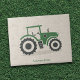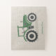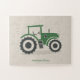 A light beige puzzle with an illustration of a green and grey farm tractor in cartoon style and customisable text below! It could be a perfect gift for a kid!