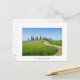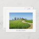 Postcard of a curvy road through the grain crops towards a farm villa with a row of cypress trees in front of it near Pienza in Val d'Orcia valley in Tuscany, Italy with a white border and the text 'Tuscany'.